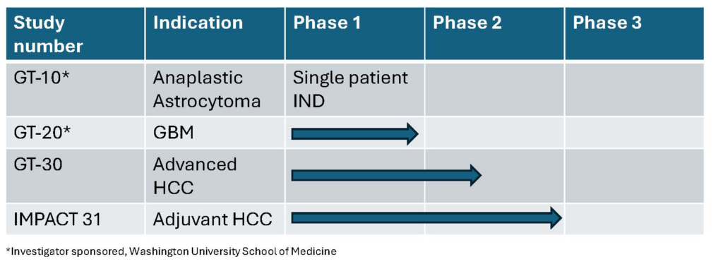 - GT-20: an investigator-sponsored Phase I clinical trial in collaboration with Washington University to treat patients with newly diagnosed glioblastoma multiforme (GBM). Click here for more information about the clinical trial.